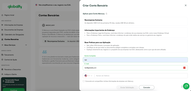Como cliente da Globalfy, você pode solicitar facilmente uma conta bancária no Mercury diretamente da nossa plataforma. Para tornar esse processo ainda mais simples, preparamos um guia passo a passo.